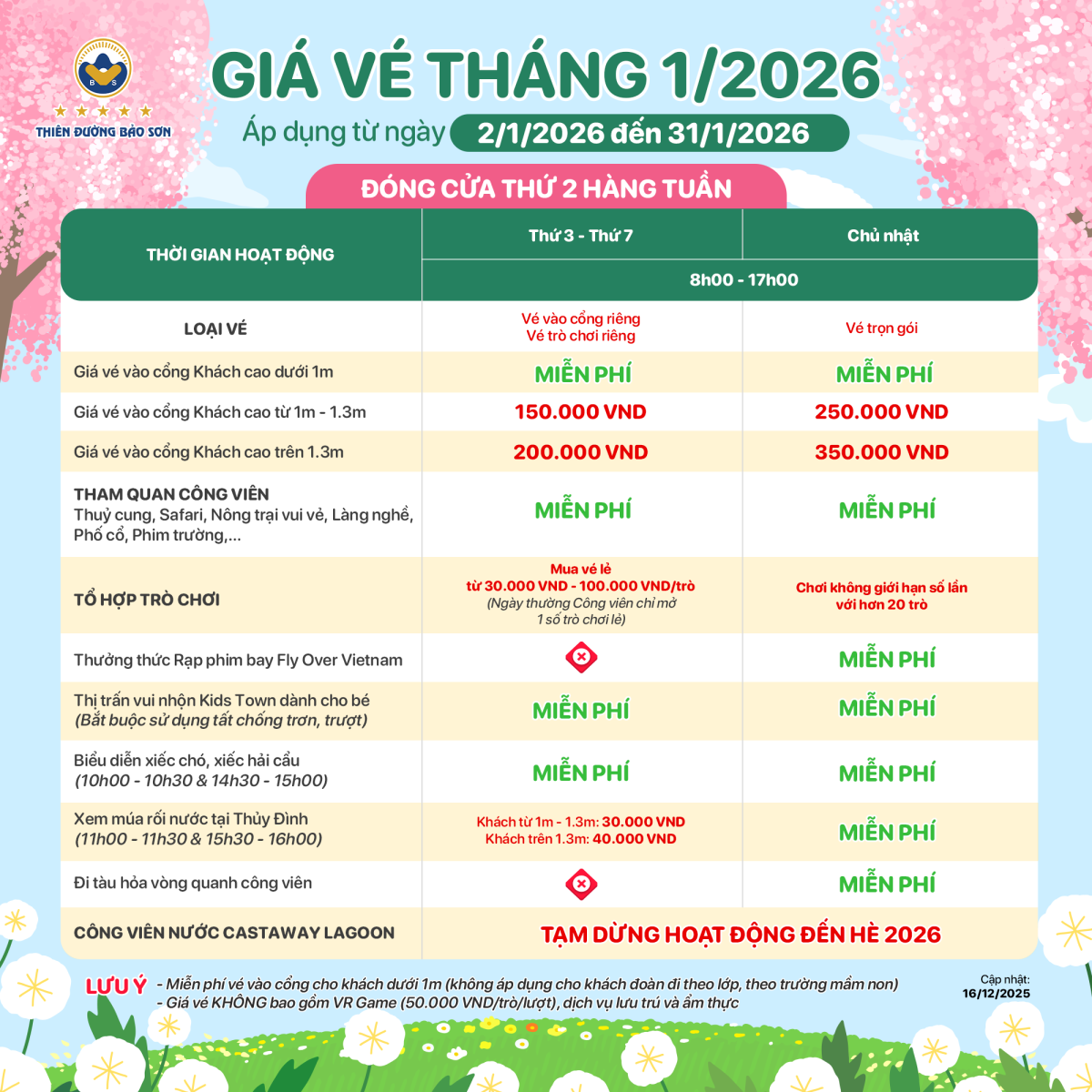 Giá vé áp dụng từ 02/01/2026 đến 31/01/2026. Công viên đóng cửa thứ 2 hàng tuần.