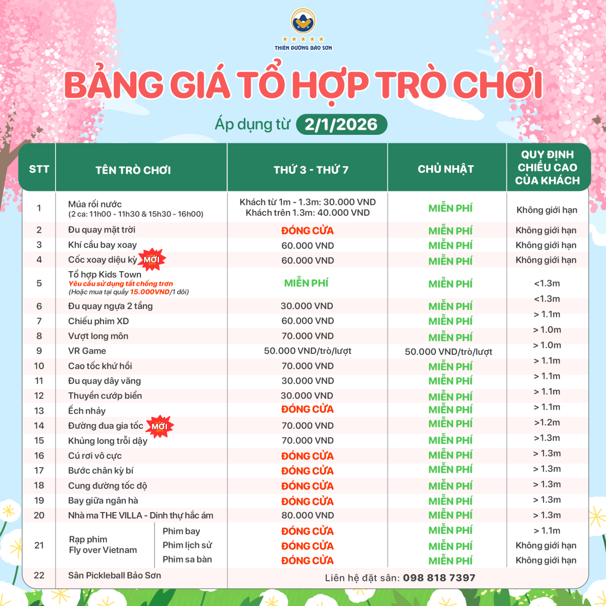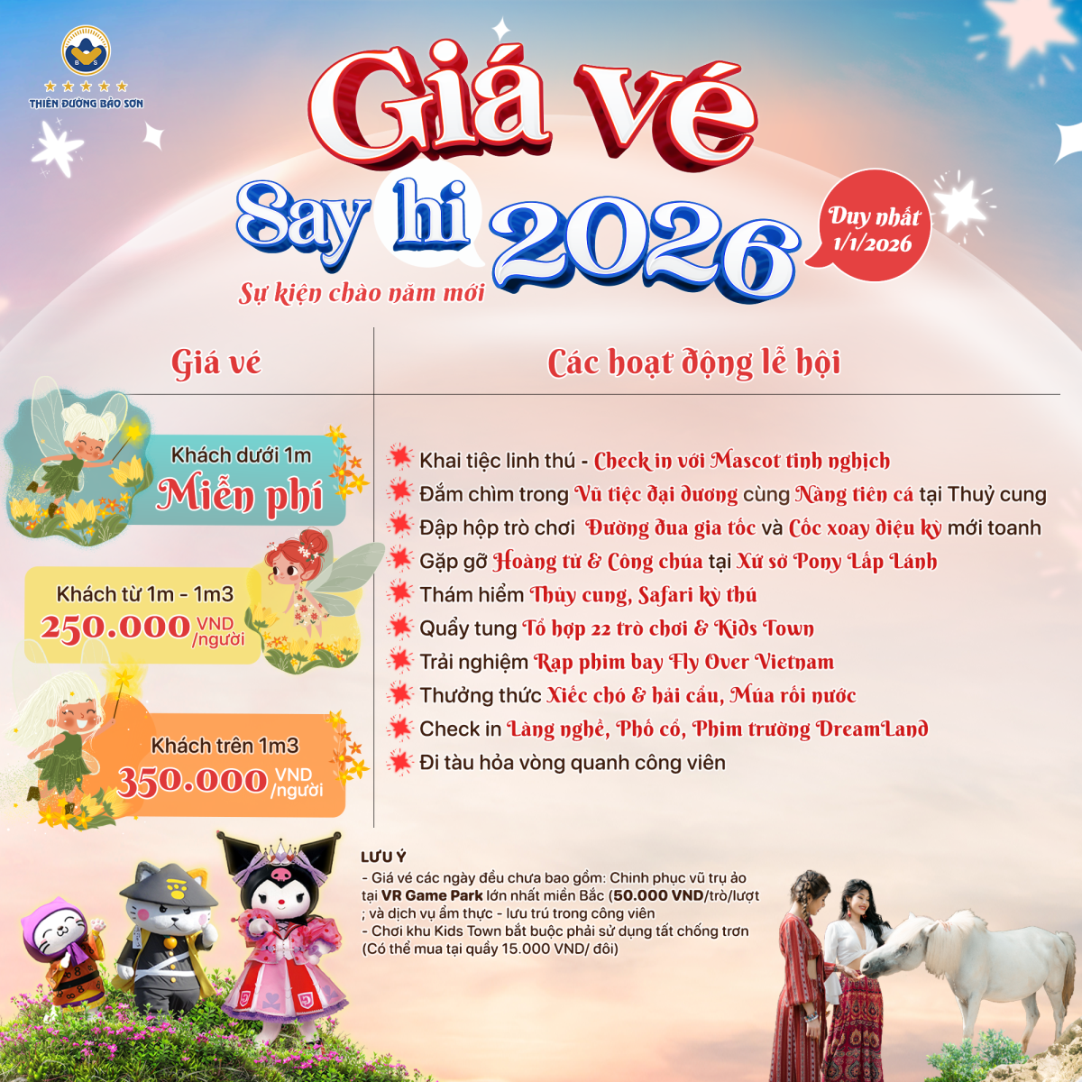 Tháng 1/2026, Công viên Thiên đường Bảo Sơn mang đến không khí khởi đầu năm mới rộn ràng với bảng giá vé linh hoạt, nhiều hoạt động vui chơi – tham quan hấp dẫn cùng loạt trải nghiệm mới lần đầu ra mắt. Đây là thời điểm lý tưởng để cả gia đình, nhóm bạn tận hưởng những ngày đầu năm tràn đầy năng lượng, niềm vui và kỷ niệm đáng nhớ.