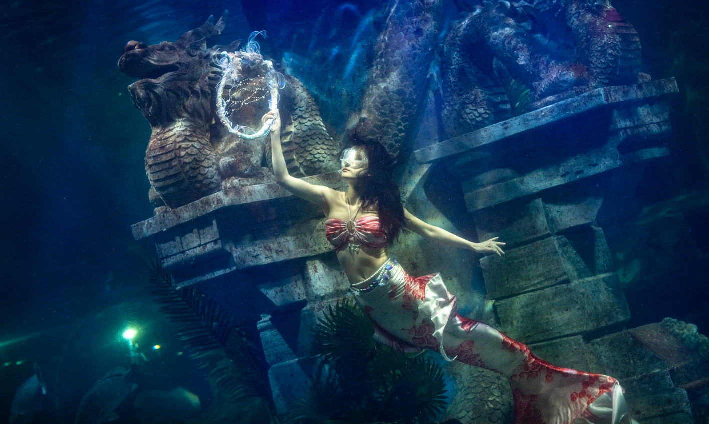 Tại khu Thủy cung, Vũ tiệc đại dương cùng Nàng tiên cá mở ra thế giới đại dương lung linh. Những chuyển động uyển chuyển trong làn nước xanh kết hợp âm nhạc và ánh sáng tạo nên trải nghiệm nhẹ nhàng, cuốn hút, phù hợp để cả gia đình cùng dừng chân thưởng thức và thư giãn.