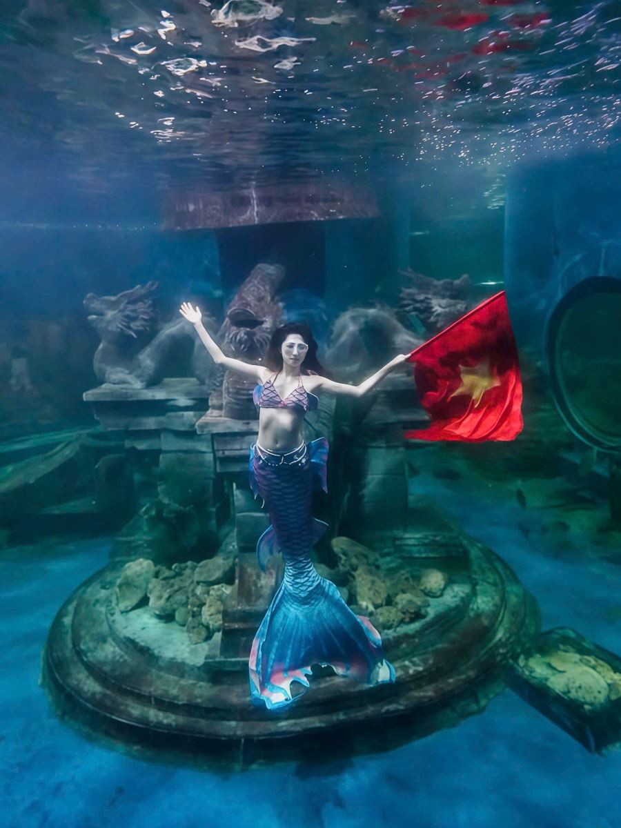 Tại Thuỷ cung, sắc xanh đại dương mở ra một thế giới hoàn toàn khác. Nàng tiên cá xuất hiện giữa dòng nước lấp lánh, xoay mình theo giai điệu của “Vũ tiệc đại dương”. Khoảnh khắc ấy khiến trẻ em mê mẩn còn người lớn cũng không khỏi trầm trồ, bởi hiệu ứng ánh sáng và chuyển động chân thật như đang đứng giữa lòng biển.