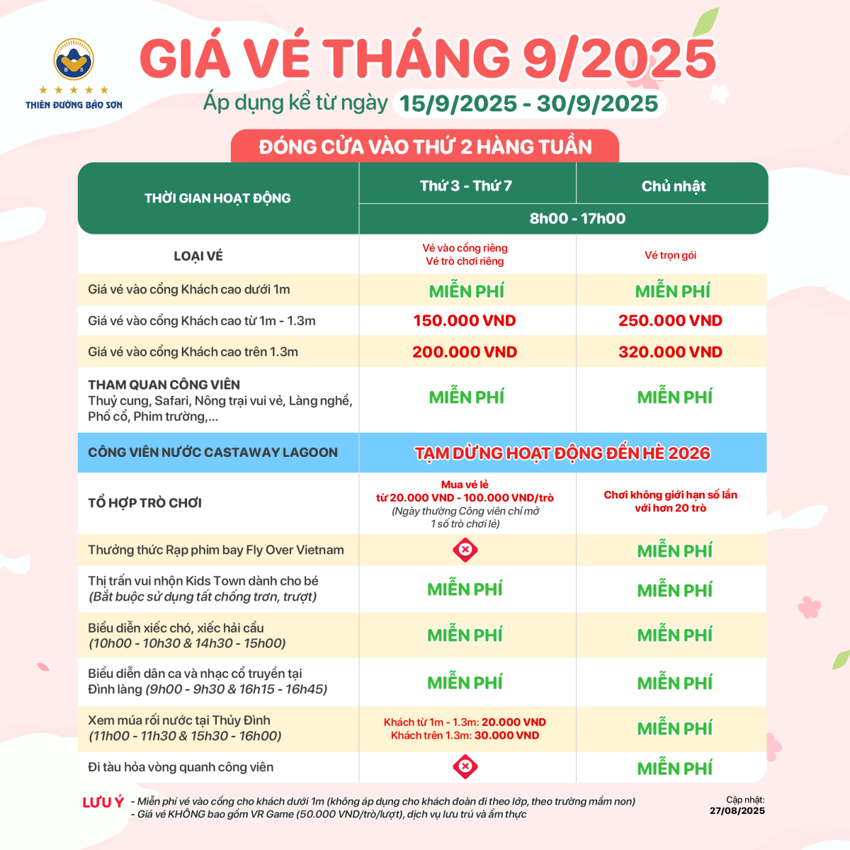 - Thông báo điều chỉnh lịch hoạt động và giá vé Công viên Thiên đường Bảo Sơn ngày 7/9/2025